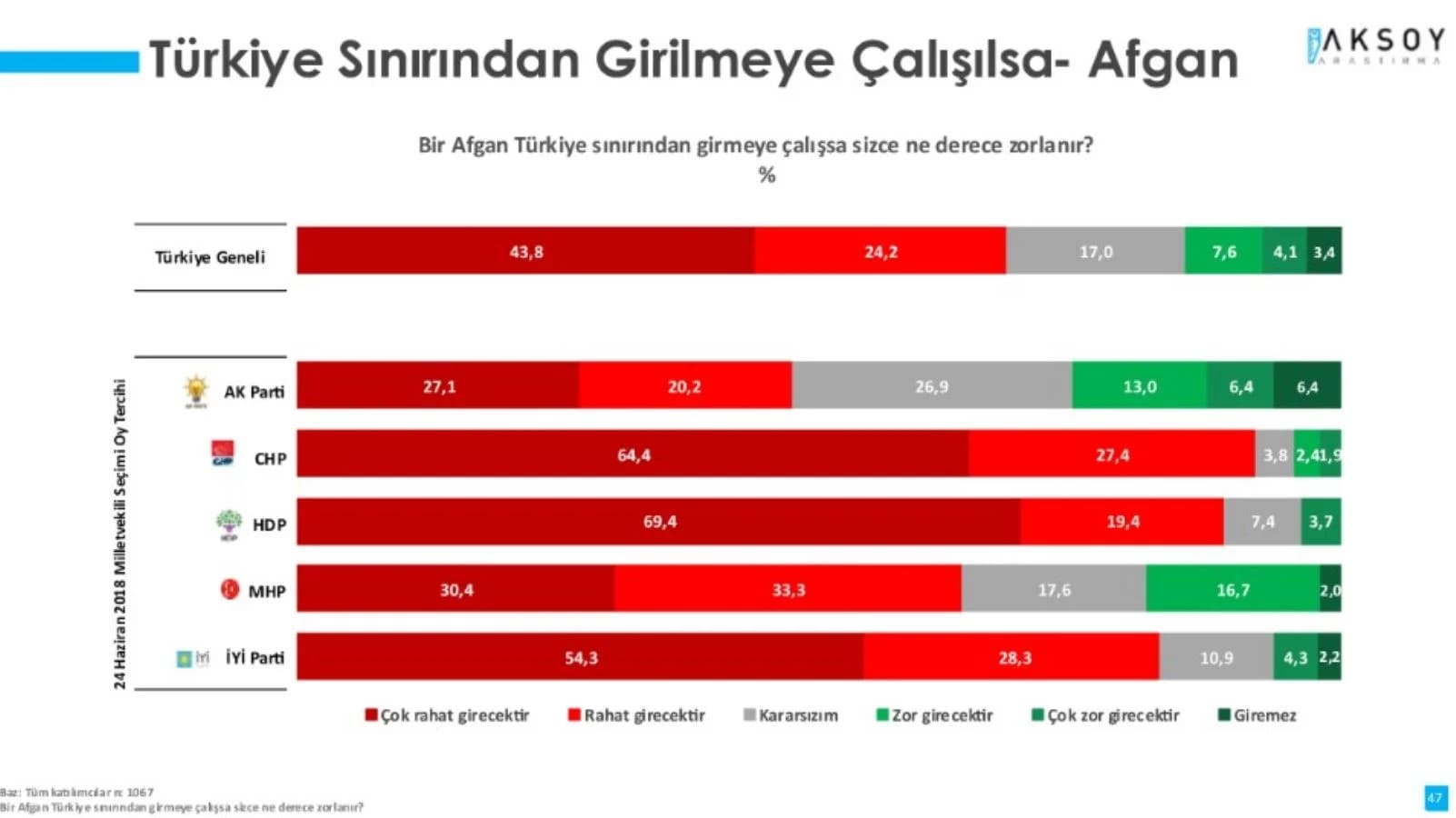 Yaşanan saldırının ardından sınır güvenliği yeniden toplumun gündemine yerleşti. Biz de toplumun bakışını anlamak için bu hafta bu konuyu ölçtük. Öncelikle Afgan, Suriyeli ve Iraklı birinin Türkiye sınırından geçmek istese ne derece zorlanacağını düşündüklerini anlamaya çalıştık. Yanıtlarını aşağıdaki grafiklerden görebilirsiniz.