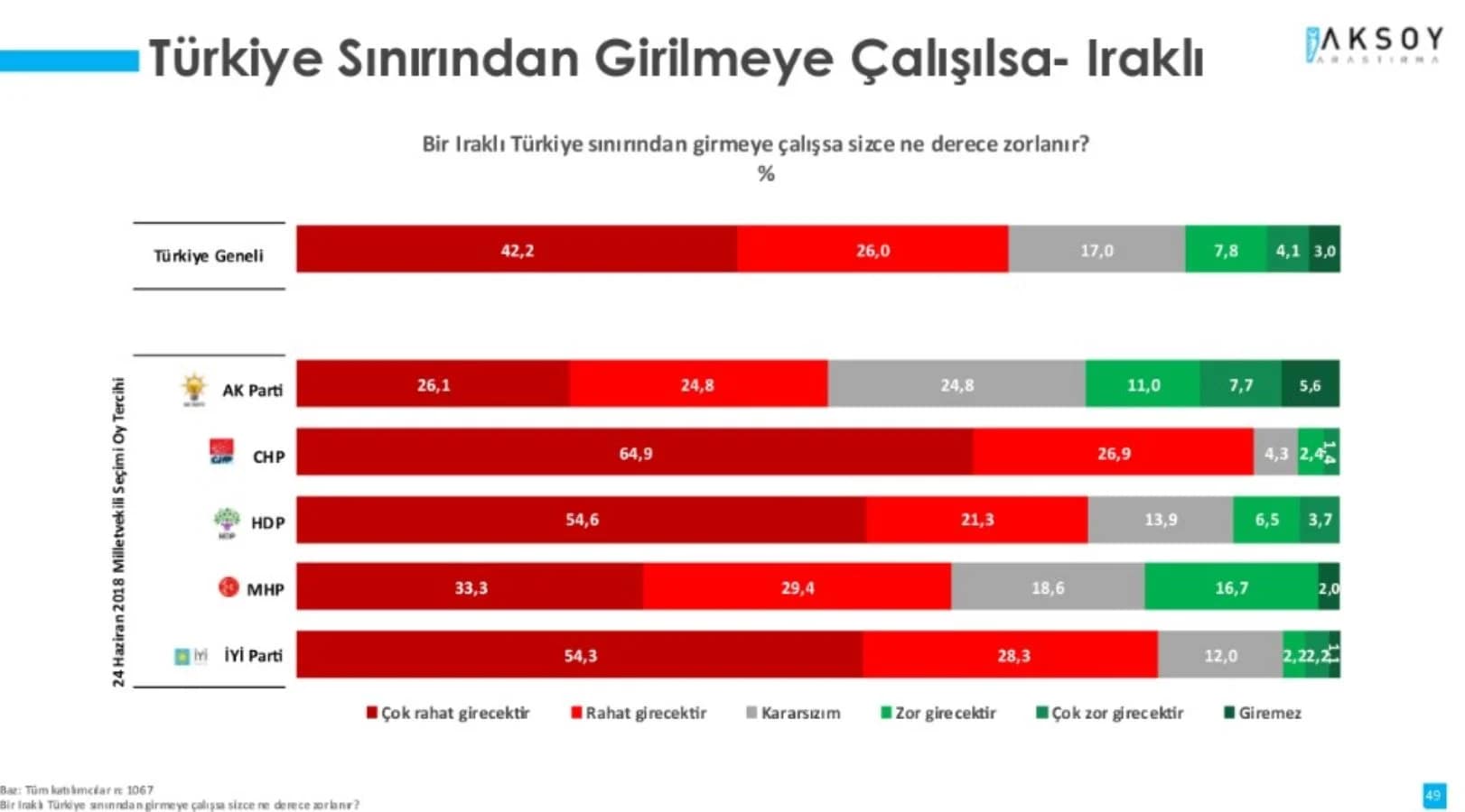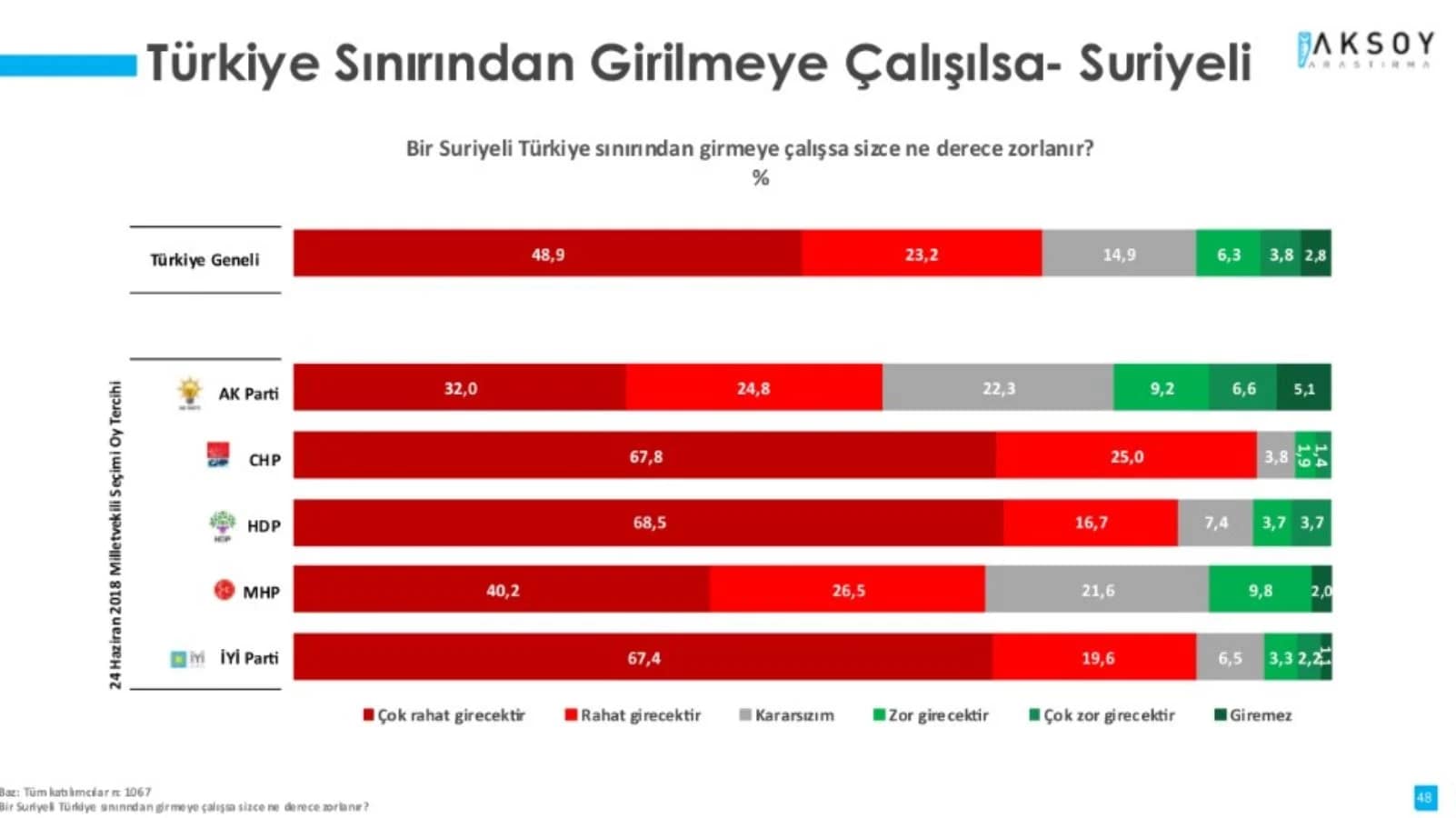 Gördüğünüz üzere 3 grupta da zorlanarak geçeceğini veya geçemeyeceğini düşünenlerin toplamı yüzde 10-15 arasında kalıyor. Özetle toplumun ezici çoğunluğu güney sınırından biri girmek isterse zorlanmadan girecektir düşüncesinde.