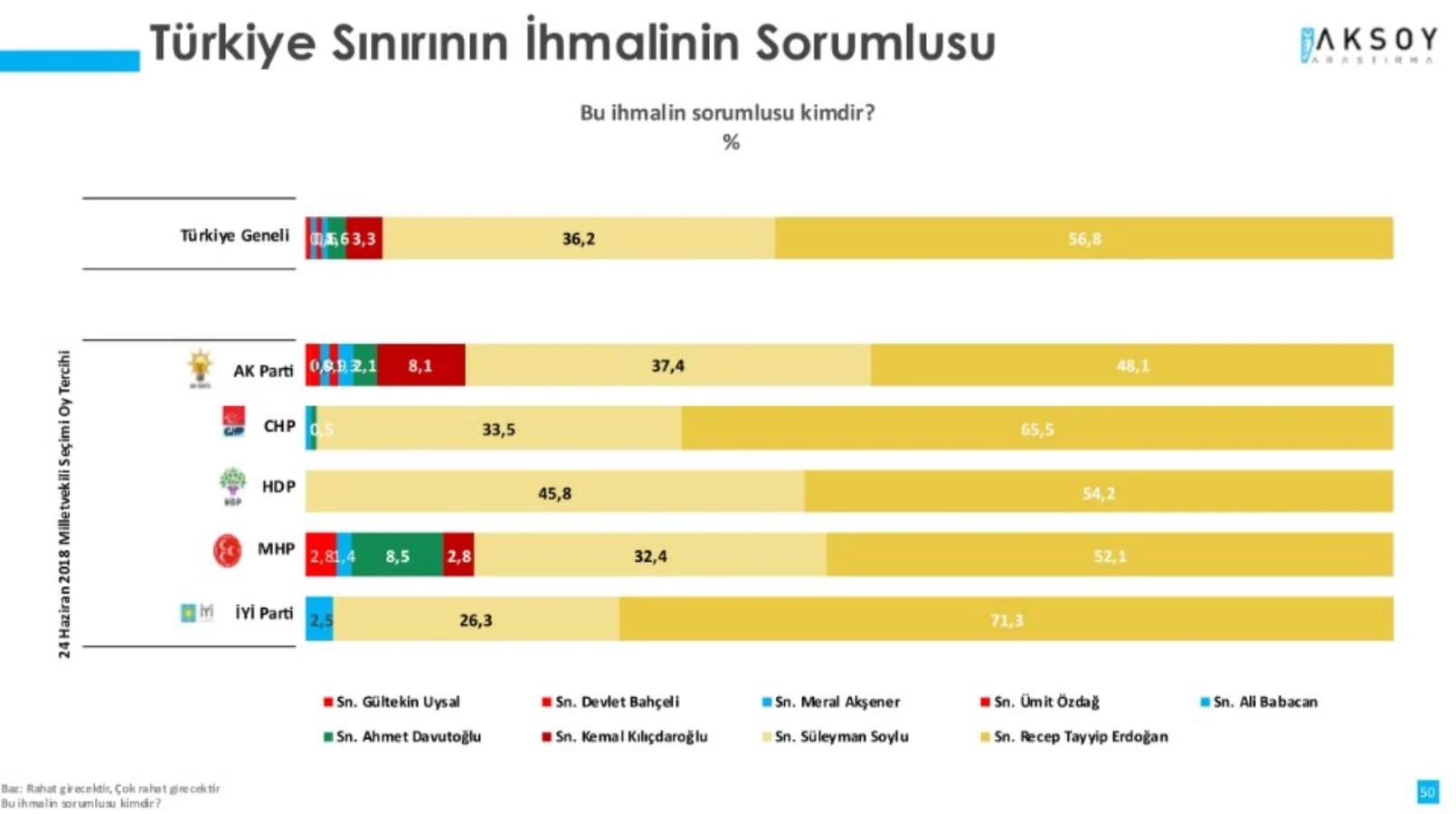 Sınır güvenliği olmadığını düşünenlerin yüzde 36,2’si ‘ihmalin sorumlusu Soylu’dur’ yanıtını verirken yüzde 56,8’i Erdoğan’ı işaret etmektedir. AKP’ye oy verenlerin de benzer yanıtlar verdiğini görüyoruz. Yani Soylu’nun avazı çıktığı kadar ortalıkta bağırması ne kendini ne Erdoğan’ı bu sorumluluktan kurtarmıyor.