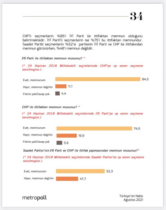 Öte yandan CHP’li seçmenlerin yüzde 85’i İyi Parti ile ittifaktan memnun olduğunu belirtti. İyi Partili seçmenlerin ise yüzde 75’i bu ittifaktan memnun. Saadet Partili seçmenlerin yüzde 52’si partisinin İyi Parti ve CHP ile ittifakından memnun görünürken, yüzde 48’i memnun değil.