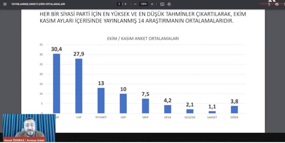14 anketten alınan ortalamaya göre AKP’nin oy oranı yüzde 30,4 olarak belirlendi. AKP’nin oyunda son seçime göre 12 puanlık bir düşüş olduğunu ifade eden Özkiraz, CHP’nin ise son seçime göre oy oranında yüzde 5’lik bir artış olduğunu söyledi. Özkiraz, İYİ Parti’de ise 3 puanlık bir yükseliş olduğunu ifade etti.