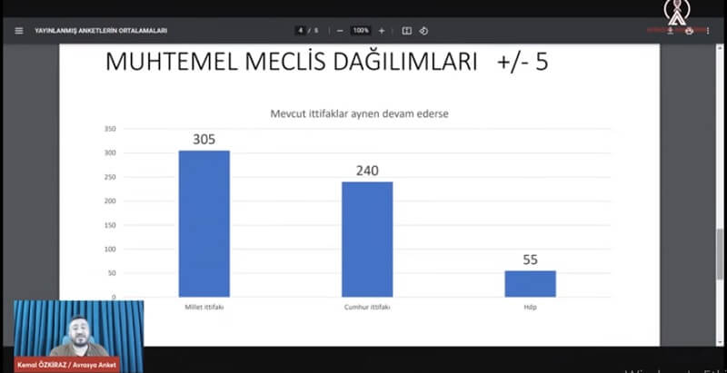 Özkiraz’ın Ekim ve Kasım ayında yayımlanmış 14 anketin ortalamasından derlediği verilere göre, Millet İttifakı Meclis’te 300 vekili geçebiliyor. Cumhur İttifakı’nda ise durum hiç iç açıcı değil. Özkiraz, Cumhur İttifakı’nın 200 vekile kadar gerileyebileceğini ifade etti.