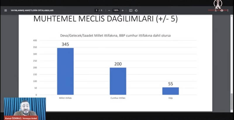 İttifakların bu şekilde gitmesi durumunda Meclis’te muhtemel sandalye dağılımları da ortaya çıktı. Anketlere göre Millet İttifakı Meclis’te 305 sandalyeye ulaşırken Cumhur İttifakı’nın sandalye sayısı 240’ta kalacak. HDP ise 55 sandalyeye sahip olacak.