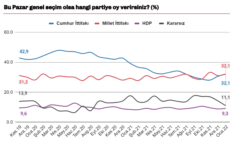 Kararsızlar dağıtıldığından sonra iktidar partisinin oy oranı yüzde 32,5 olarak görülüyor. Adalet ve Kalkınma Partisi’ni, 2020 yılının Kasım ayından beri en yüksek oy oranına ulaşan Cumhuriyet Halk Partisi yüzde 25,7 oranındaki oy oranı ile takip ediyor.