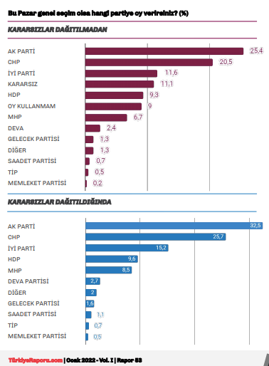 ‘‘Kararsızlar, çoklu mütekabiliyet analizi kullanılarak, kararsız olduğunu ifade eden katılımcıların tüm diğer sorulara verdikleri cevaplar göz önüne alınarak, bu eğilimleri doğrultusunda dağıtılmıştır. Oy kullanmayacağını belirtenler partiler arasında eşit olarak dağıtılmıştır.’’
