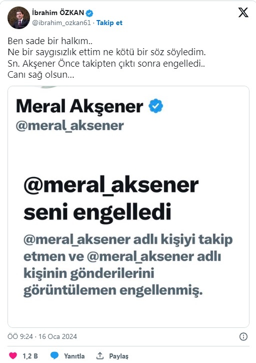 “Ben sade bir halkım… Ne bir saygısızlık ettim ne kötü bir söz söyledim. Sayın Akşener önce takipten çıktı sonra engelledi… Canı sağ olsun…”