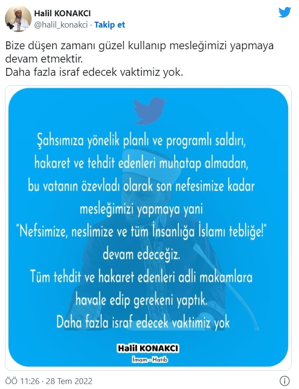 “Şahsımıza yönelik planlı ve programlı saldırı, hakaret ve tehdit edenleri muhatap almadan, bu vatanın öz evladı olarak son nefesimize kadar mesleğimizi yapmaya yani ‘Nefsimize, neslimize ve tüm insanlığa tebliğe devam edeceğiz’ tüm tehdit ve hakaret edenleri adli makamlara havale edip gerekeni yaptık. Daha fazla israf edecek vaktimiz yok.”
