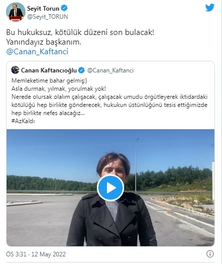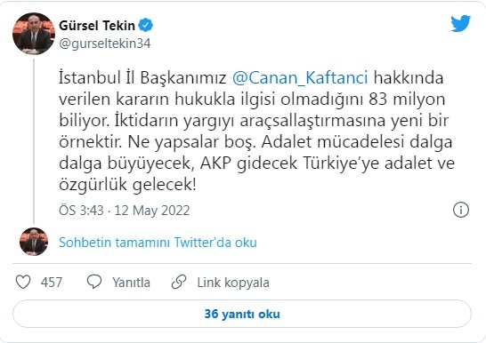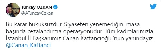 Kaftancıoğlu yaptığı ilk açıklamada, “Biz iktidardaki kötülüğü gönderinceye kadar bu ülkede sadece Canan Kaftancıoğlu için değil, 84 milyon için hukuku ve hukukun üstünlüğünü sağlayıncaya kadar her şekilde çalışmaya devam edeceğiz. Asla ve asla umudunuzu kaybetmeyin” dedi.