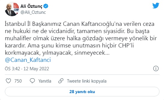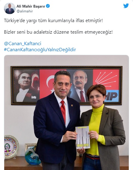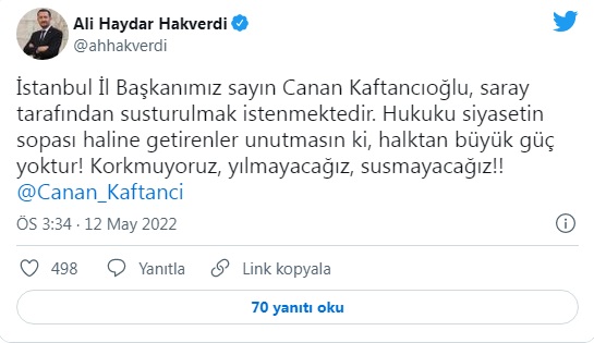 CHP Ankara Milletvekili Ali Haydar Hakverdi: ”İstanbul İl Başkanımız sayın Canan Kaftancıoğlu, saray tarafından susturulmak istenmektedir. Hukuku siyasetin sopası haline getirenler unutmasın ki, halktan büyük güç yoktur! Korkmuyoruz, yılmayacağız, susmayacağız!!”
