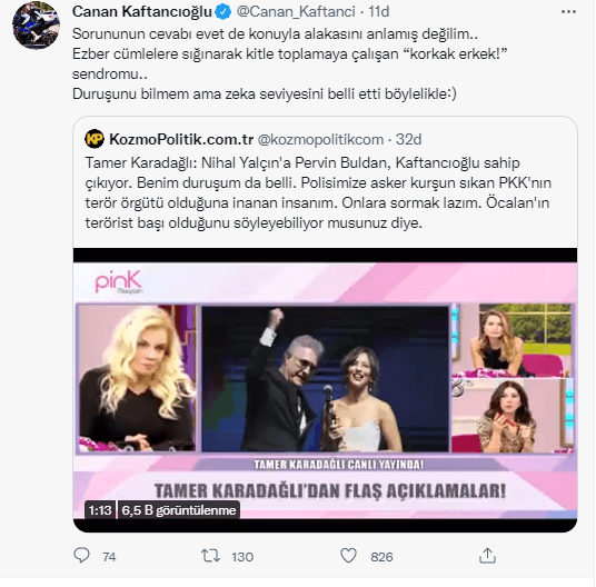 CHP İstanbul İl Başkanı Canan Kaftancıoğlu, Altın Portakal’da Nihal Yalçın’a ödülünü verdiği sıradaki tavırlarıyla eleştirilen oyuncu Tamer Karadağlı’nın “Selahattin Demirtaş’a özgürlük.’ E Selahattin Demirtaş ne dedi? ‘Abdullah Öcalan’ın heykelini dikeceğiz’ dedi. Yani hanımefendi bunu mu savunuyor? Pervin Buldan ona sahip çıkıyor, Canan Kaftancıoğlu ona sahip çıkıyor. Burada bir linç girişimi var, benim duruşum da belli olan bir duruş.” sözlerine yanıt verdi.
