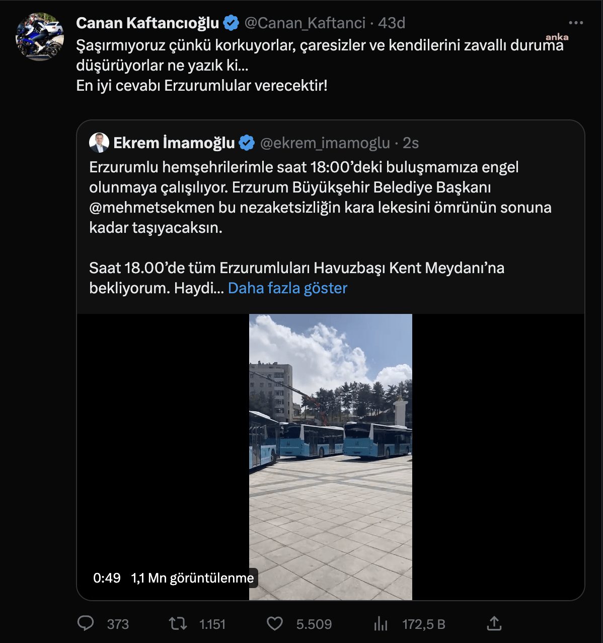 CHP İstanbul İl Başkanı Canan Kaftancıoğlu, İstanbul Büyükşehir Belediye (İBB) Başkanı Ekrem İmamoğlu’nun Erzurum’da düzenleyeceği miting öncesinde alanın belediye otobüsleriyle doldurulmasına “Şaşırmıyoruz çünkü korkuyorlar, çaresizler ve kendilerini zavallı duruma düşürüyorlar ne yazık ki… En iyi cevabı Erzurumlular verecektir” sözleriyle tepki gösterdi.