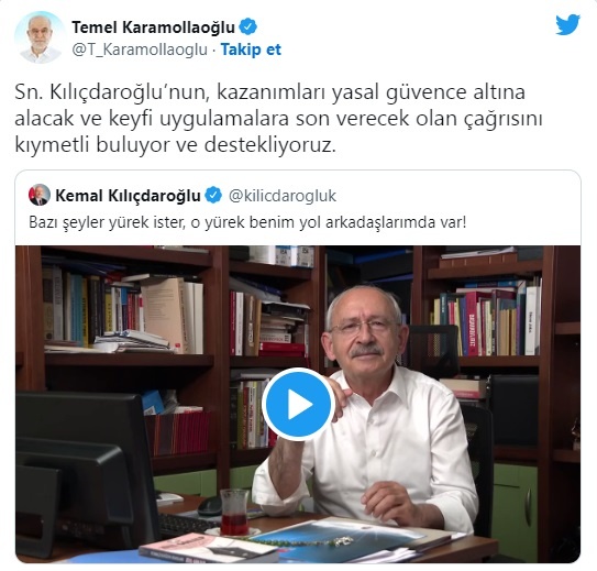 “Sn. Kılıçdaroğlu’nun, kazanımları yasal güvence altına alacak ve keyfi uygulamalara son verecek olan çağrısını kıymetli buluyor ve destekliyoruz.”