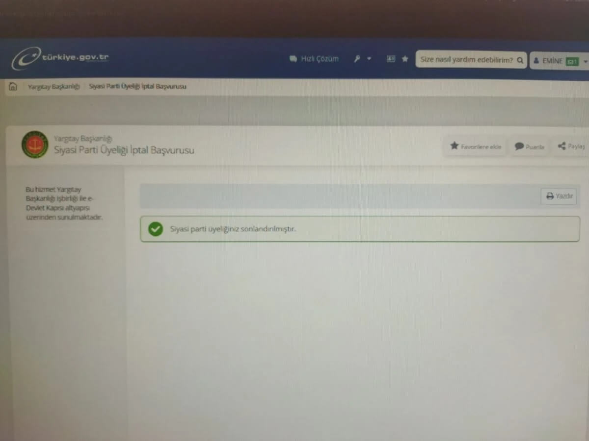 İzmir’in Buca ilçesinde yaşayan Emine Akbaba, 2021 yılının eylül ayında telefonuna gelen, “Ailemize hoş geldiniz. Üyelik işlemleriniz başarıyla gerçekleştirilmiştir” mesajıyla AKP Buca İlçe Teşkilatı’na üye yapıldığını öğrendi. Mesajın ardından e-Devlet uygulamasına girerek parti üyeliği olup olmadığını sorgulayan Akbaba, AKP Buca İlçe Teşkilatı’nda aktif üyeliğinin bulunduğunu gördü. Akbaba, durumu fark etmesinin ardından e-Devlet üzerinden parti üyeliğinden istifa etti.