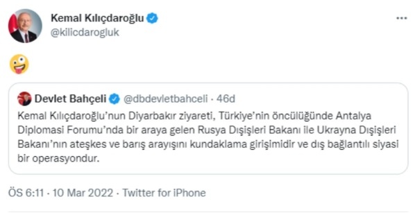 CHP lideri Kılıçdaroğlu ise MHP liderine Twitter hesabı üzerinden ’emoji’ ile yanıt verdi.