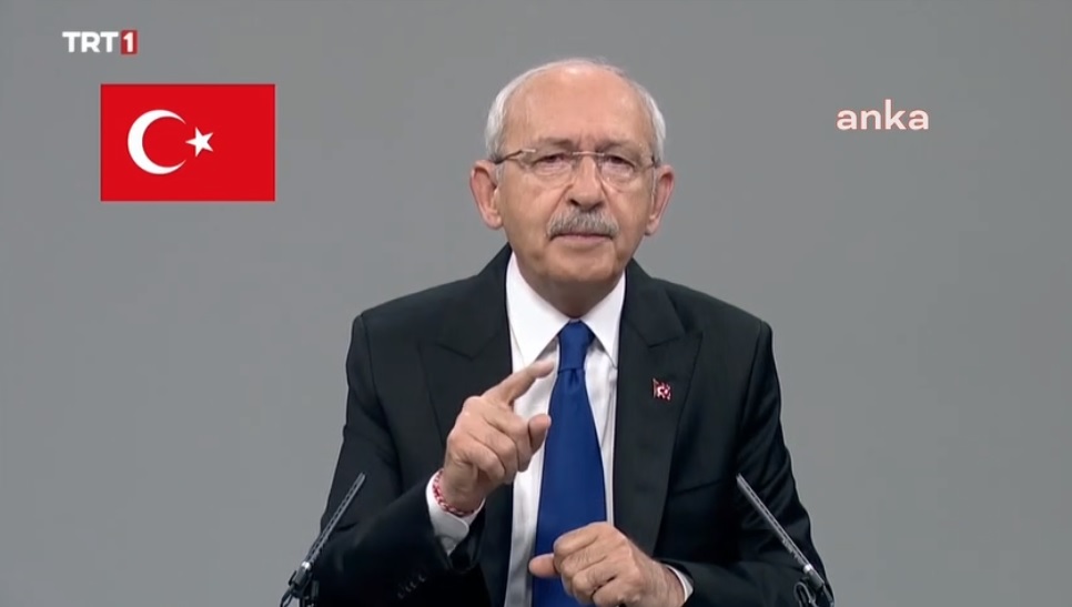 Millet İttifakı Cumhurbaşkanı Adayı Kemal Kılıçdaroğlu TRT‘de yaptığı konuşmada; “Bu artık bir seçim değil, bir referandum. Neyin referandumu? Erdoğan ile devam edecek miyiz, etmeyecek miyiz referandumu. 10 değil, 30 milyon kaçağın yaşadığı bir Türkiye istiyor muyuz referandumu. Kız çocuklarımıza kötü gözle bakan zihniyete müsaade edecek miyiz referandumu. Terörle mücadele ettiğini söyleyip, Anayasa’nın ilk 4 maddesine göz koyanlara dur diyecek miyiz referandumu. En ufak tehdide boyun eğip kendi vatan toprağını teröristlere teslim edenleri onaylayacak mıyız referandumu. Depremde o canlara çadır, kan satanları affedecek miyiz referandumu. Enflasyon yükselsin mi, ocağımıza incir ağacı dikilsin mi, dolar 30 TL’ye, peynir 300 TL’ye çıksın mı referandumu. Bankacılık sistemi dinamitlensin, insanlarımız bankadan nakit avans çekemeyecek duruma düşsün mü referandumu. Gençlerimiz işsizliğe güçsüzlüğe mahkûm olsun mu referandumu. Emeklilerimizin kaderi sefalet mi olsun referandumu” dedi.
