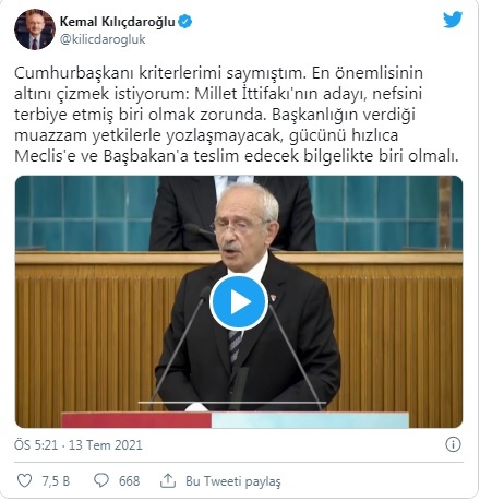 Kılıçdaroğlu, Twitter’dan yaptığı paylaşımda şu ifadeleri kullandı: