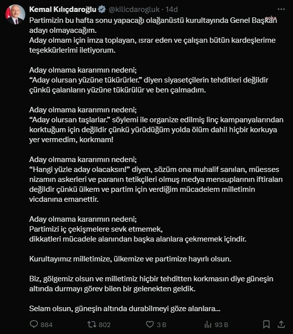 7. CHP Genel Başkanı Kemal Kılıçdaroğlu, sosyal medya hesabından aday olmayacağını açıkladı. Kılıçdaroğlu şunları kaydetti: