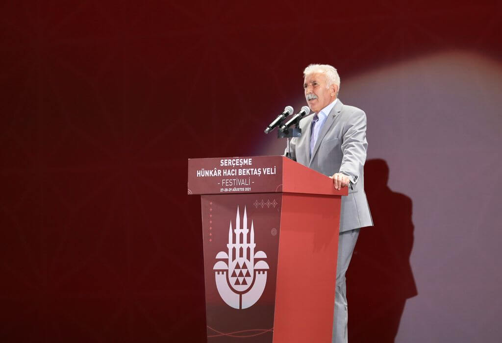 “Onun dergahında eğitim görenler, eğitimlerini tamamladıktan sonra Anadolu ve Rumeli coğrafyasına dağıldılar. Bugün Avrupa’nın pek çok ülkesinde onun düşünceleri toplumu aydınlatıyor. O, hep adaleti savunmuştur, devletin adaletle, liyakatle yönetilmesi gerektiğini söylemiş ve bunu dillendirmiştir. Hacı Bektaşi Veli’ye göre insan iyilikte yarışmalı, haksızlığa karşı direnmeli, adaletten sapmamalı ve hiçbir zaman umutsuzluğa düşmemelidir. Hünkar böyle söylüyor. Ama bugün dünyada acı gerçekler var. Bugün dünyada, savaş alanlarının, açlık ve kıtlık yaşayan bölgelerin büyük bir bölümü İslam ülkeleri. İslam ülkelerinde acı var, kan var, gözyaşı var. Yerinden yurdundan edilen, ülkelerinden göç etmek zorunda olan Müslümanlar var. Afganistan’da yaşananlar sadece bizi değil tüm dünyayı endişelendiriyor. Demokrasi, insan hakları, eğitim sağlık, toplumsal eşitlik, adalet gibi alanlarda temel alanlarda Müslüman ülkeler gerçekten de perişanlık yaşıyor. Dileriz yaşanan acı dökülen kanlar son bulur. İslam dünyasında huzur ve adalet gelir, adalet ve huzur kazanmış olur.”