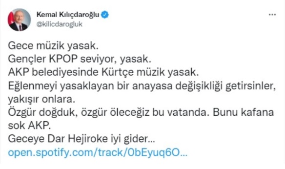 Müzik yasağını hatırlatan Kılıçdaroğlu, “AKP belediyesinde Kürtçe müzik yasak” dedi.