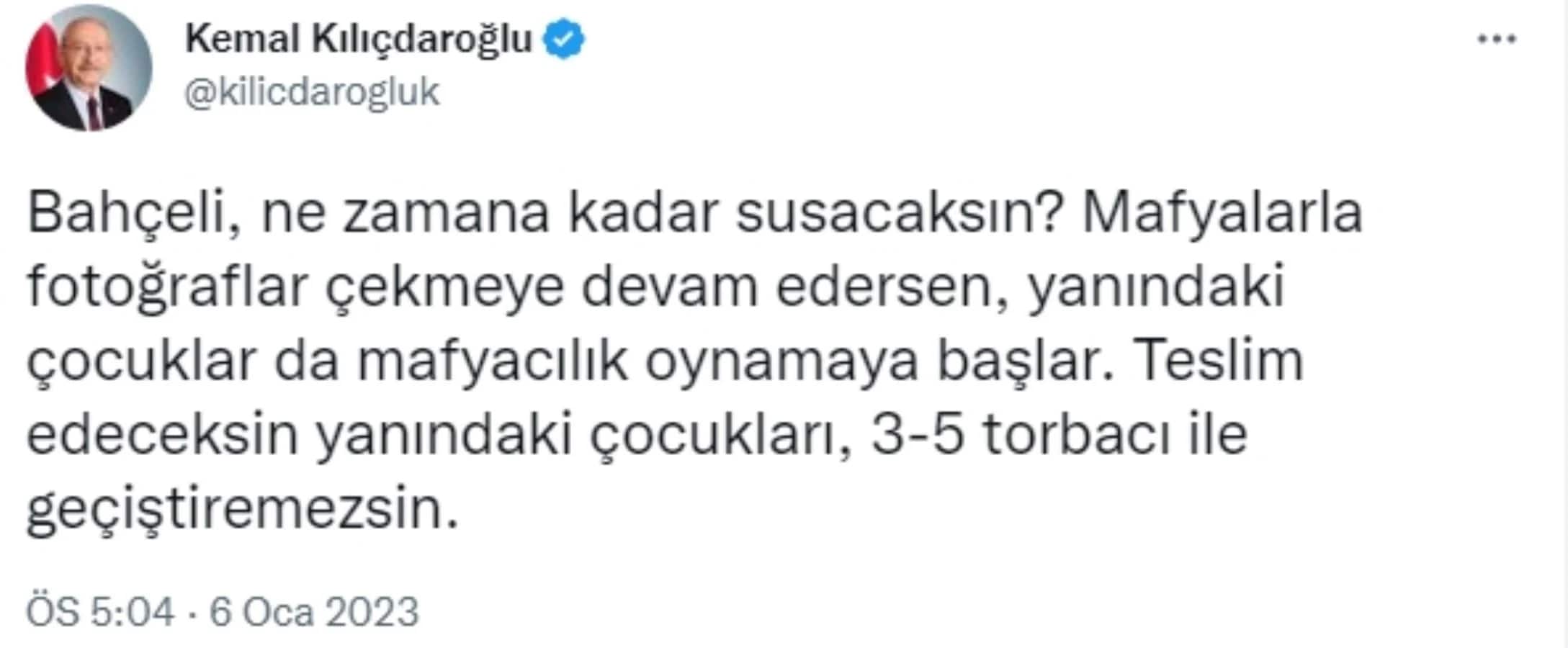 “Bahçeli, ne zamana kadar susacaksın?” diyen Kılıçdaroğlu, “Mafyalarla fotoğraflar çekmeye devam edersen, yanındaki çocuklar da mafyacılık oynamaya başlar. Teslim edeceksin yanındaki çocukları, 3-5 torbacı ile geçiştiremezsin” ifadelerini kullandı.