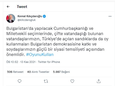 “Bulgaristan’da yapılacak Cumhurbaşkanlığı ve Milletvekili seçimlerinde, çifte vatandaşlığı bulunan vatandaşlarımızın, Türkiye’de açılan sandıklarda da oy kullanmaları Bulgaristan demokrasisine katkı ve soydaşlarımızın güçlü bir siyasi temsiliyeti açısından önemlidir.”