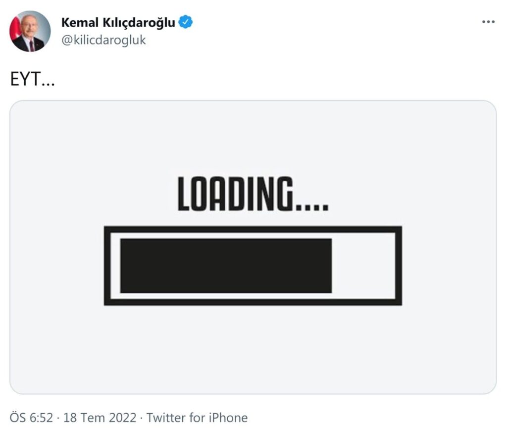 Gelişmelerin ardından Kılıçdaroğlu, Twitter hesabından yeni bir paylaşım yaptı. Mesajında emeklilikte yaşa takılanlar düzenlemesinin çıkabileceğinin sinyalini veren Kılıçdaroğlu, Türkçe olarak ‘yükleniyor’ anlamına gelen ‘Loading…’ kelimesini paylaştı.