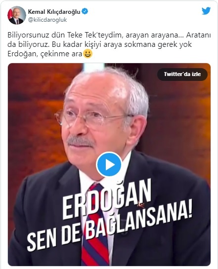 Kılıçdaroğlu bugün sosyal medya hesabından, “Biliyorsunuz dün Teke Tek’teydim, arayan arayana… Aratanı da biliyoruz. Bu kadar kişiyi araya sokmana gerek yok Erdoğan, çekinme ara 🙂 “ mesajıyla birlikte dünkü programdan bir kesiti paylaştı.