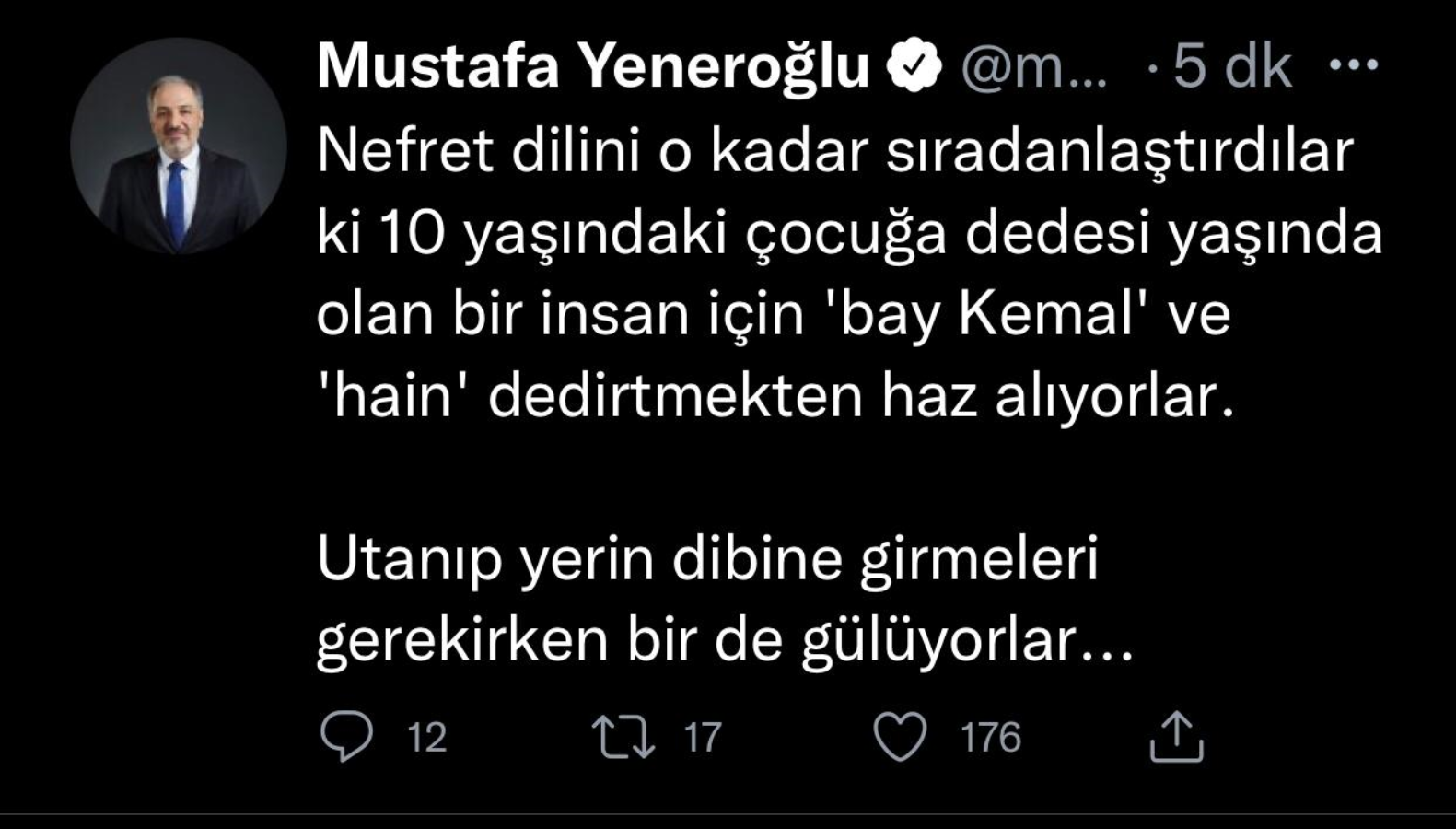 Yeneroğlu, Twitter hesabından yaptığı paylaşımda, “Nefret dilini o kadar sıradanlaştırdılar ki 10 yaşındaki çocuğa dedesi yaşında olan bir insan için ‘bay Kemal’ ve ‘hain’ dedirtmekten haz alıyorlar. Utanıp yerin dibine girmeleri gerekirken bir de gülüyorlar…” ifadelerine yer verdi.