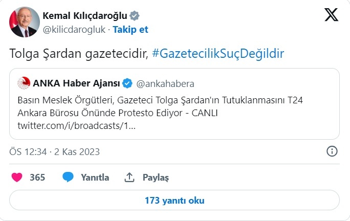 CHP Genel Başkanı Kemal Kılıçdaroğlu, gözaltına alındıktan sonra tutuklanan gazeteci Tolga Şardan hakkında Twitter hesabından yaptığı paylaşımda "Tolga Şardan gazetecidir, #GazetecilikSuçDeğildir" ifadelerini kullandı.