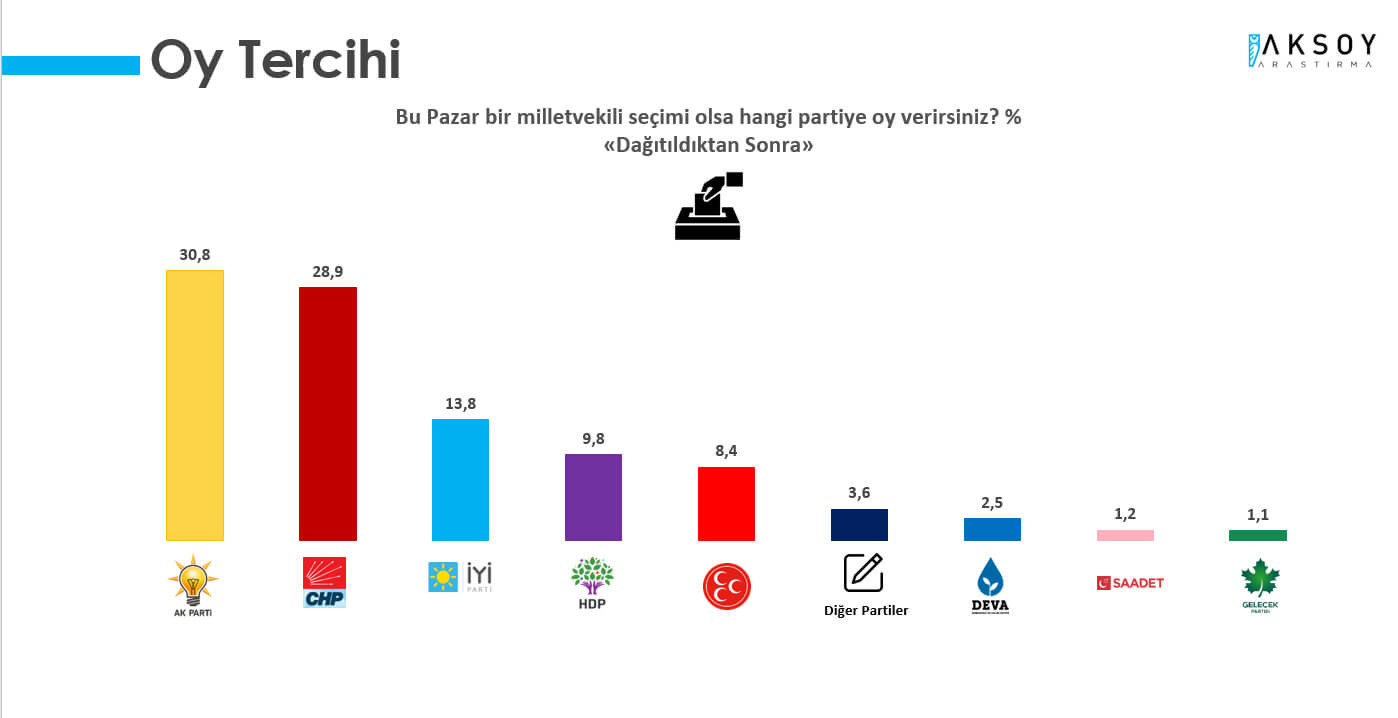 Kararsız seçmenlerin oy oranlarına göre dağıtıldığı anketin sonuçları ise, AKP yüzde 30.8, CHP yüzde 28.9, İYİ Parti yüzde 13.8, HDP yüzde 9.8, MHP yüzde 8.4, DEVA yüzde 2.5, Saadet Partisi yüzde 1.2, Gelecek Partisi yüzde 1.1 ve Diğer partiler yüzde 3.6 olarak belirlendi.