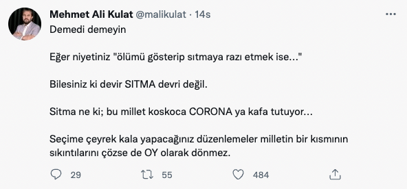“Seçime çeyrek kala yapacağınız düzenlemeler milletin bir kısmının sıkıntılarını çözse de OY olarak dönmez.” uyarısında bulunan Mehmet Ali Kulat, “Demedi demeyin Eğer niyetiniz “ölümü gösterip sıtmaya razı etmek ise…” Bilesiniz ki devir SITMA devri değil. Sitma ne ki; bu millet koskoca CORONA ya kafa tutuyor… Seçime çeyrek kala yapacağınız düzenlemeler milletin bir kısmının sıkıntılarını çözse de OY olarak dönmez.” ifadelerini kullandı.
