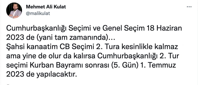 Kişisel Twitter hesabında yaptığı paylaşımda Twitter’dan yaptığı açıklamada, “Cumhurbaşkanlığı Seçimi ve Genel Seçim 18 Haziran 2023’te (yani tam zamanında)” ifadesini kullanan Kulat, ikinci tur olasılığı için de şunları söyledi:
