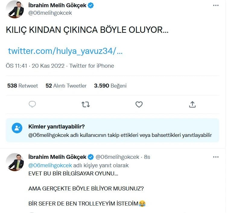 Gökçek gelen tepkilerin ardından paylaştığı ikinci mesajında “Evet bu bir bilgisayar oyunu… Ama gerçekte böyle biliyor musunuz? Bir sefer de ben trolleyeyim istedim” dedi.