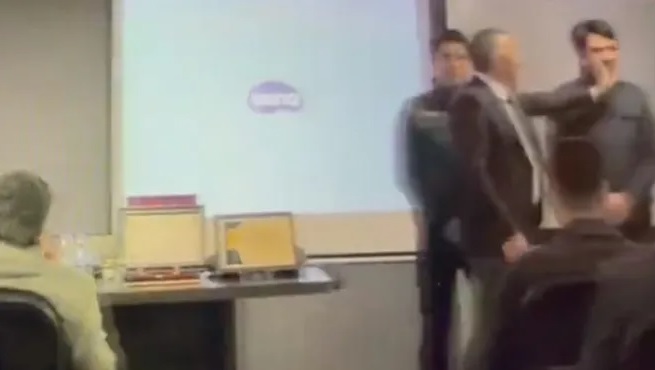 Toplantıda konuşan Osman Erdoğan, ayakta duran iki memuru göstererek “İhtar aldığı gün sözleşmesi feshedilir. Ama bu adam öyle değil, bak sakallı gelmiş” dedikten sonra bir memura tokat atıyor. Erdoğan, tokatın ardından “Eşek sıpası” diyerek hakaret ediyor.