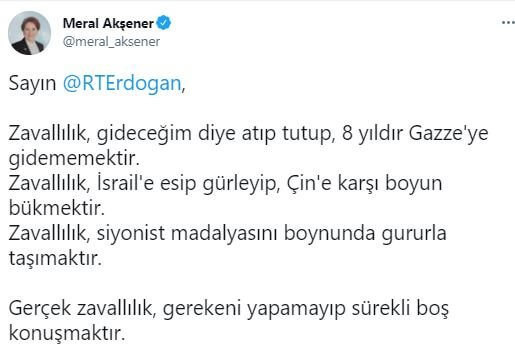 Cumhurbaşkanı Erdoğan'ın "Filistin dendiği zaman benim ciğerlerim adeta sese gelir ve o (Akşener), Filistin’in haritadaki yerini bilmeyecek kadar zavallıdır" sözlerine sosyal medya hesabından yanıt veren İYİ Parti Genel Başkanı Meral Akşener, "Gerçek zavallılık, gerekeni yapamayıp sürekli boş konuşmaktır" ifadesini kullandı.