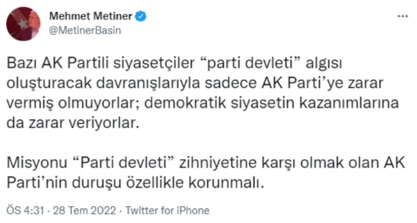 Eski AKP milletvekili Mehmet Metiner, Twitter hesabından partisindeki siyasetçilere tepki gösteren ifadeler kullandı.