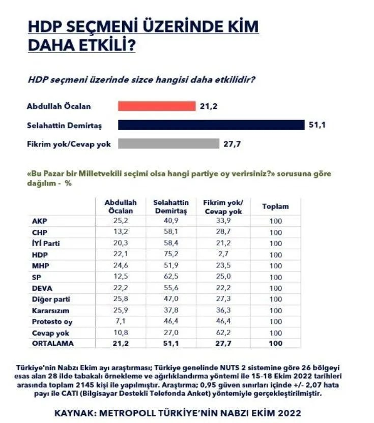 Metropoll Araştırma, bütün parti seçmenlerine “HDP seçmeni üzerinde Öcalan mı yoksa Demirtaş mı daha etkilidir?” sorusunu da sordu.