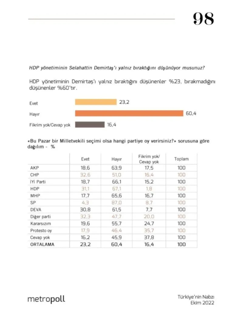 Metropoll, ekim ayı araştırmasında ankete katılanlara, "HDP yönetiminin Demirtaş’ın yalnız bıraktığını düşünüyor musunuz?" diye sordu. Yüzde 23,2 evet oyu çıkarken yüzde 60,4 de hayır oyu çıktı.