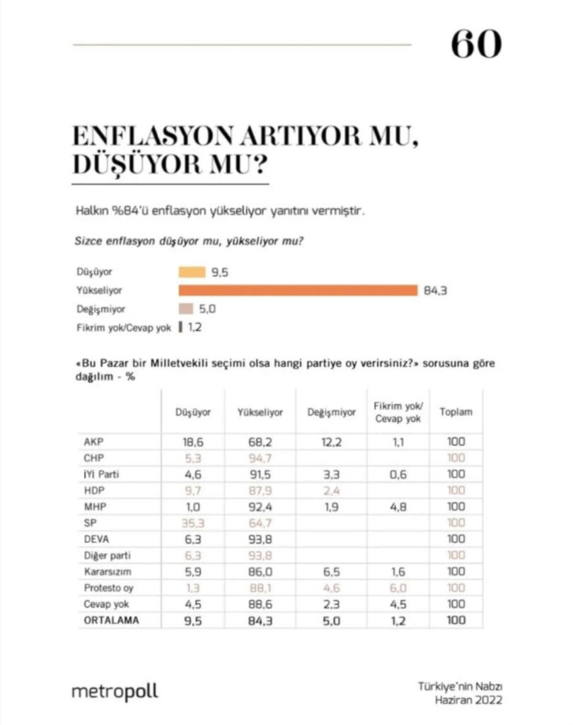 Anket sonucuna göre AKP seçmenin yüzde 68,2’si, MHP’nin yüzde 92,4’ü enflasyon “yükseliyor” dedi.