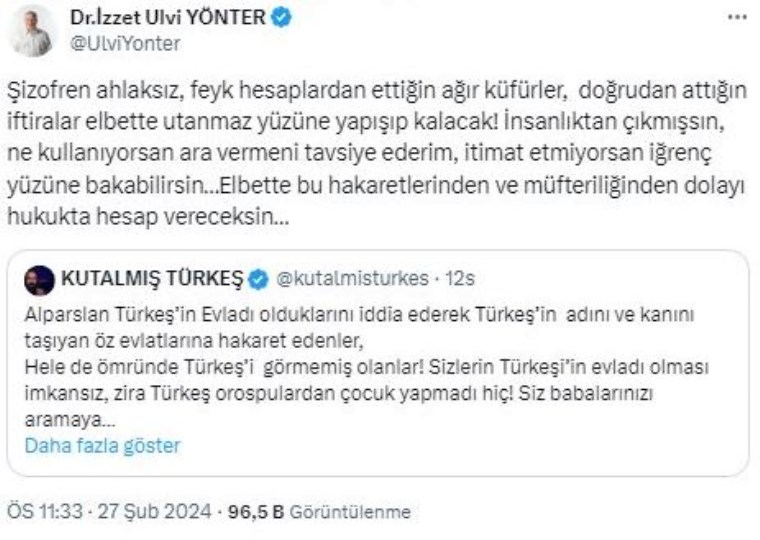 Kutalmış Türkeş, sosyal medya hesabından yaptığı paylaşımda, MHP Genel Başkan Yardımcısı ve MHP İstanbul Milletvekili Edip Semih Yalçın ile Milliyetçi Hareket Partisi Genel Başkan Yardımcısı ve MHP İstanbul Milletvekili İzzet Ulvi Yönter’i de hedef alarak şu ifadeleri kullanmıştı: