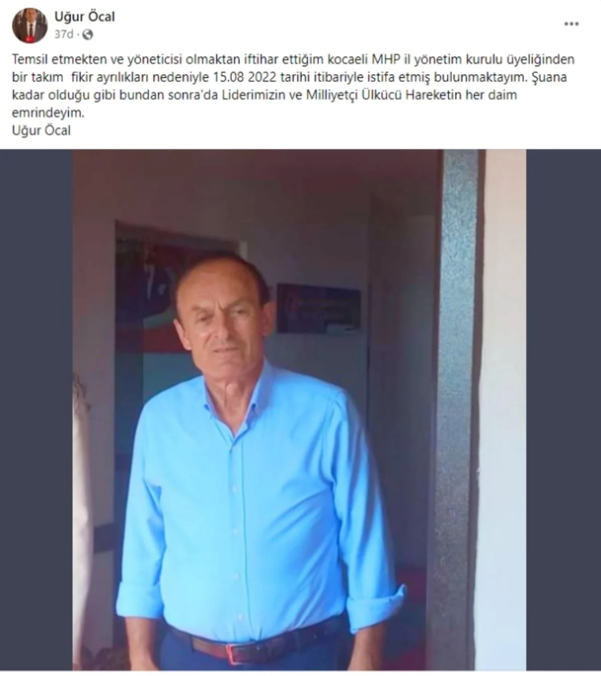 Milliyetçi Hareket Partisi (MHP) Kocaeli İl Yönetim Kurulu üyesi Uğur Öcal, sosyal medya hesabından yaptığı kısa açıklama ile istifa ettiğini duyurdu.