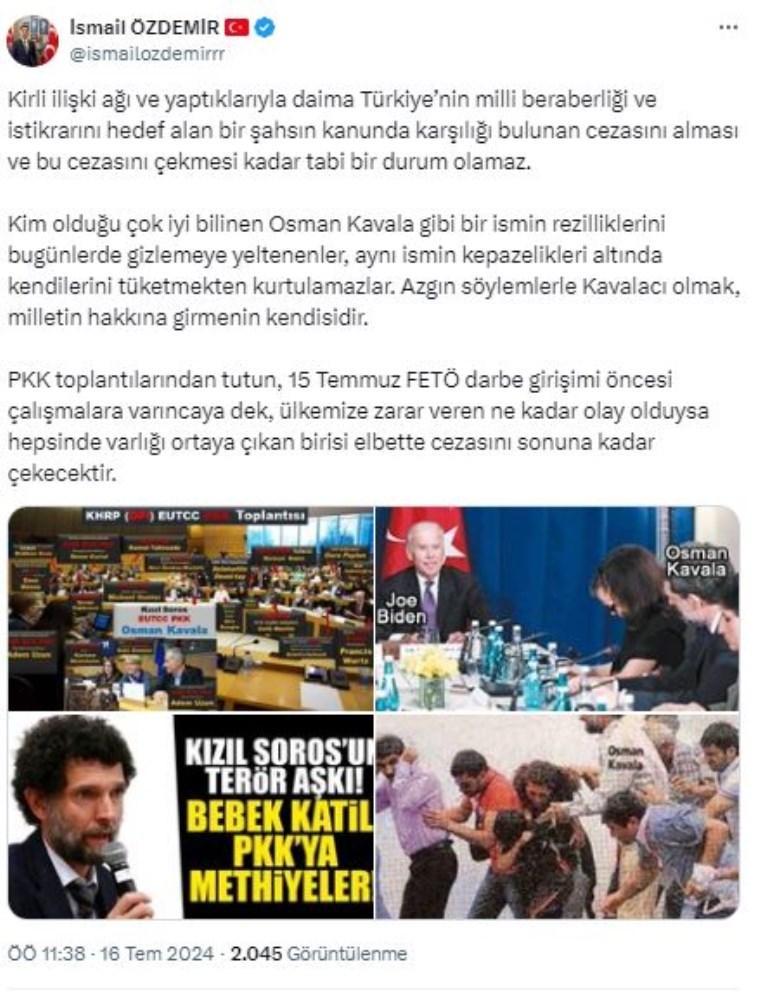MHP Medya, İletişim ve Dijital Mecralardan Sorumlu Genel Başkan Yardımcısı İsmail Özdemir tarafından yapılan açıklamada “Kirli ilişki ağı ve yaptıklarıyla daima Türkiye’nin milli beraberliği ve istikrarını hedef alan bir şahsın kanunda karşılığı bulunan cezasını alması ve bu cezasını çekmesi kadar tabi bir durum olamaz” denildi.