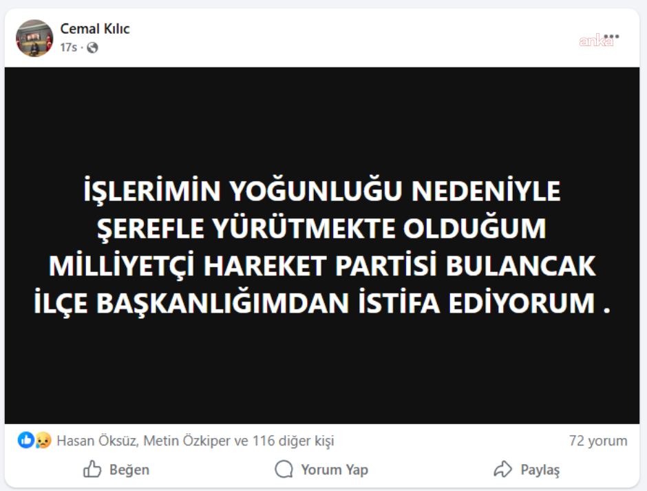 MHP Giresun Bulancak İlçe Başkanı Cemal Kılıç, “iş yoğunluğu” sebebiyle görevinden istifa etti.
