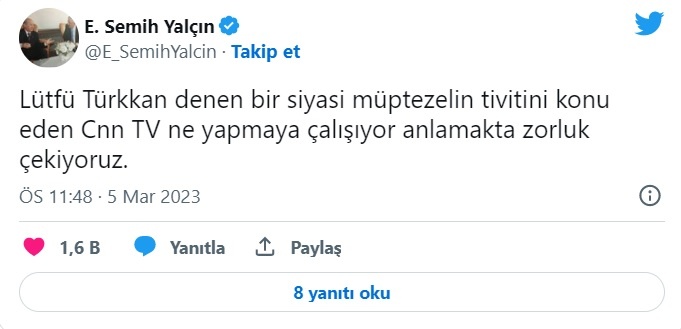 “Lütfü Türkkan denen bir siyasi müptezelin tivitini konu eden Cnn TV ne yapmaya çalışıyor anlamakta zorluk çekiyoruz.”
