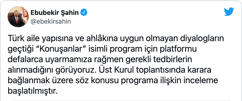 Genç’in sözleriyle başlayan tartışma sonrası Radyo ve Televizyon Üst Kurulu (RTÜK) programla ilgili inceleme başlattı. RTÜK Başkanı Ebubekir Şahin, “Türk aile yapısına ve ahlakına uygun olmayan diyalogların geçtiği ‘Konuşanlar’ isimli program için platformu defalarca uyarmamıza rağmen gerekli tedbirlerin alınmadığını görüyoruz. Üst Kurul toplantısında karara bağlanmak üzere söz konusu programa ilişkin inceleme başlatılmıştır” dedi.