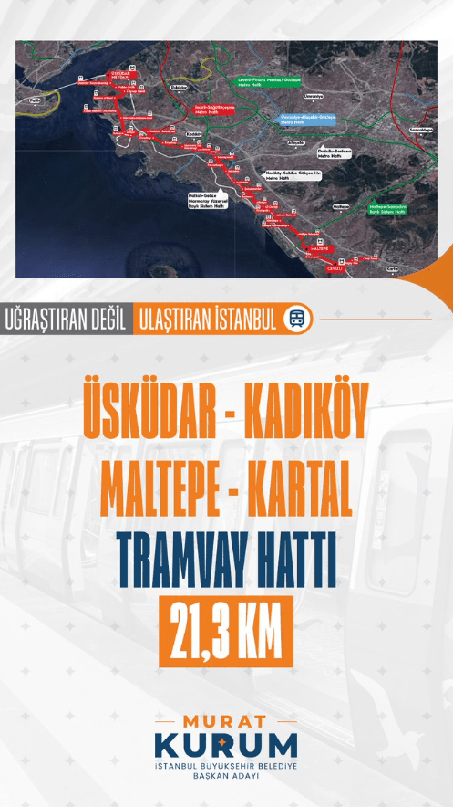 Cumhur İttifakı’nın İBB Adayı Murat Kurum, peş peşe yaptığı gaflarla dikkat çekiyor. Kurum, bir kez daha İBB Başkanı Ekrem İmamoğlu’nun projesini seçim vaadi olarak duyurdu. Sosyal medya hesabından Kurum’un duyurduğu Üsküdar – Kadıköy – Maltepe – Kartal Tramvay hattı projesini, 2023 yılında açıklayan İmamoğlu, hattın 33 istasyondan oluşacağını ve çalışmalarının başladığı bilgisini paylaştı.