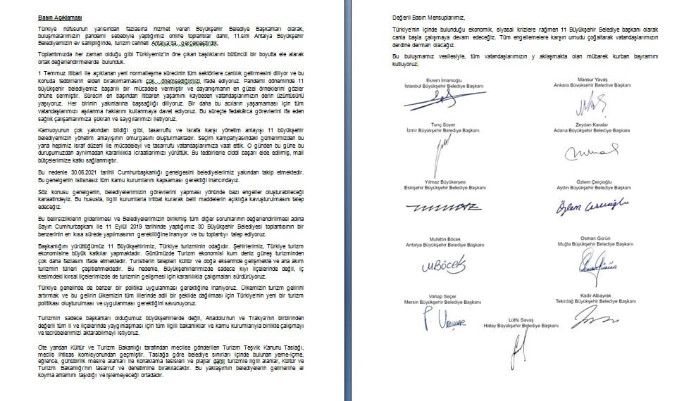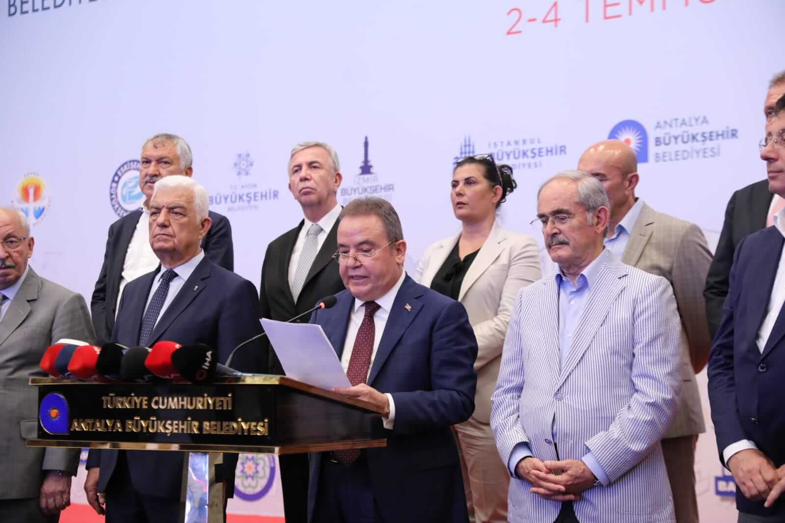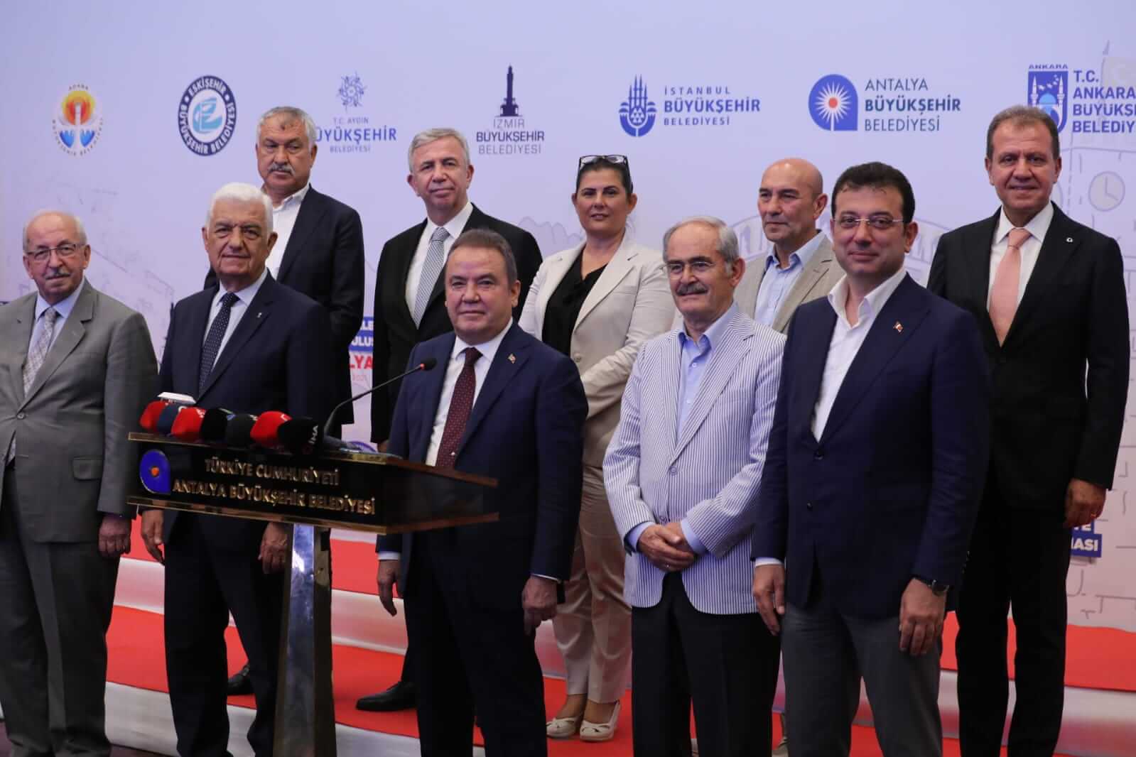 İstanbul Büyükşehir Belediye Başkanı Ekrem İmamoğlu, Ankara Büyükşehir Belediye Başkanı Mansur Yavaş, İzmir Büyükşehir Belediye Başkanı Tunç Soyer, Adana Büyükşehir Belediye Başkanı Zeydan Karalar, Eskişehir Büyükşehir Belediye Başkanı Yılmaz Büyükerşen, Aydın Büyükşehir Belediye Başkanı Özlem Çerçioğlu, Antalya Büyükşehir Belediye Başkanı Muhittin Böcek, Muğla Büyükşehir Belediye Başkanı Osman Gürün, Mersin Büyükşehir Belediye Başkanı Vahap Seçer, Tekirdağ Büyükşehir Belediye Başkanı Kadir Albayrak ve Hatay Büyükşehir Belediye Başkanı Lütfi Savaş’ın katılımlarıyla gerçekleşen toplantının ardından bir açıklama yayınlandı. Bu açıklama açıklama şöyle: