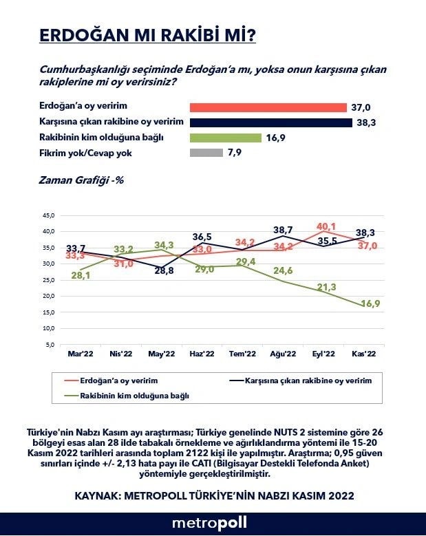 Eylül ayında Erdoğan’a oy veririm diyenlerin oranı yüzde 40 iken kasım ayında bu oran yüzde 37’ye geriledi. Erdoğan’ın rakibine oy vereceğini söyleyenlerin oranı ise yüzde 35,5’den yüzde 38,3’e çıktı. Rakibin isminin önemli olduğunu söyleyenlerin oranı da yüzde 21,3’den yüzde 16,9’a geriledi.