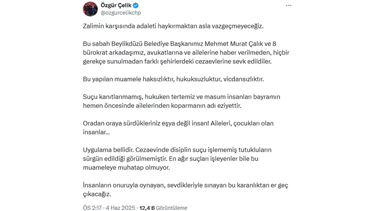 CHP İstanbul İl Başkanı Özgür Çelik, İBB operasyonlarında tutuklananlar arasında Murat Çalık'ın da olduğu 8 kişinin İzmir'e nakledileceğine ilişkin tepki gösterdi. Çelik, "Zalimin karşısında adaleti haykırmaktan asla vazgeçmeyeceğiz. İnsanların onuruyla oynayan, sevdikleriyle sınayan bu karanlıktan er geç çıkacağız" ifadelerini kullandı.