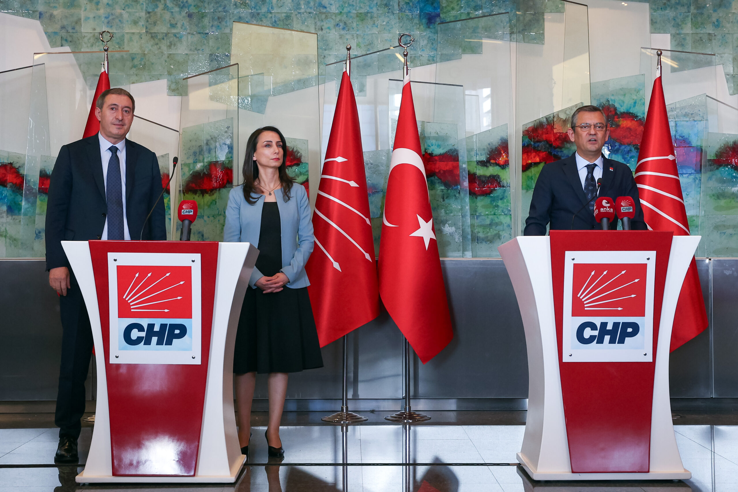 Cumhuriyet Halk Partisi Genel Başkanı Özgür Özel, Halkların Eşitlik ve Demokrasi Partisi (DEM Parti) Eş Genel Başkanları Tülay Hatimoğulları ve Tuncer Bakırhan ile CHP Genel Merkezi'nde ortak basın açıklaması yaptı. (Fotoğraf: Alp Eren Kaya)
